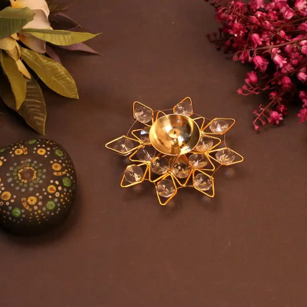 The Crystal Puja Diya Small features a delicate, clear crystal construction that reflects and refracts light, creating a captivating glow during your ceremonies. Its compact size is perfect for small altars or puja spaces, allowing it to fit seamlessly into any setting while adding a touch of grace.