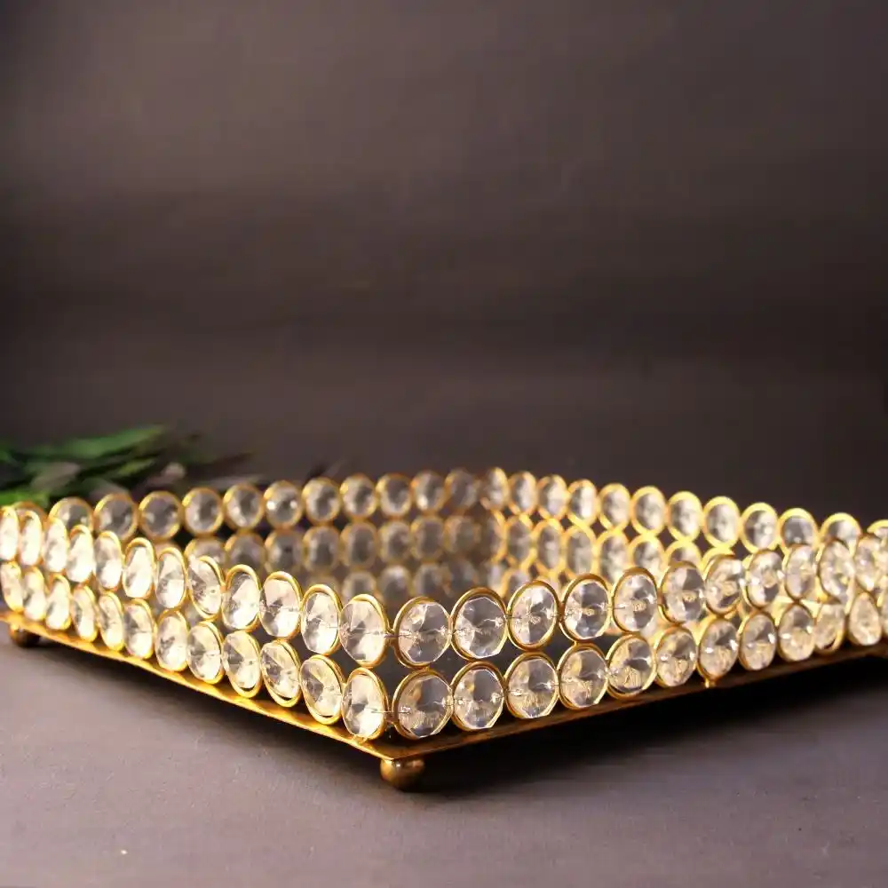 The tray features a rectangular shape with a stunning silver rim that complements the clear, faceted crystal center. The crystal’s sparkling surface catches and reflects light, creating a dazzling effect that elevates the presentation of your favorite items. Whether you’re serving cocktails, appetizers, or simply using it as a decorative piece, this tray adds a touch of luxury and style to any occasion.