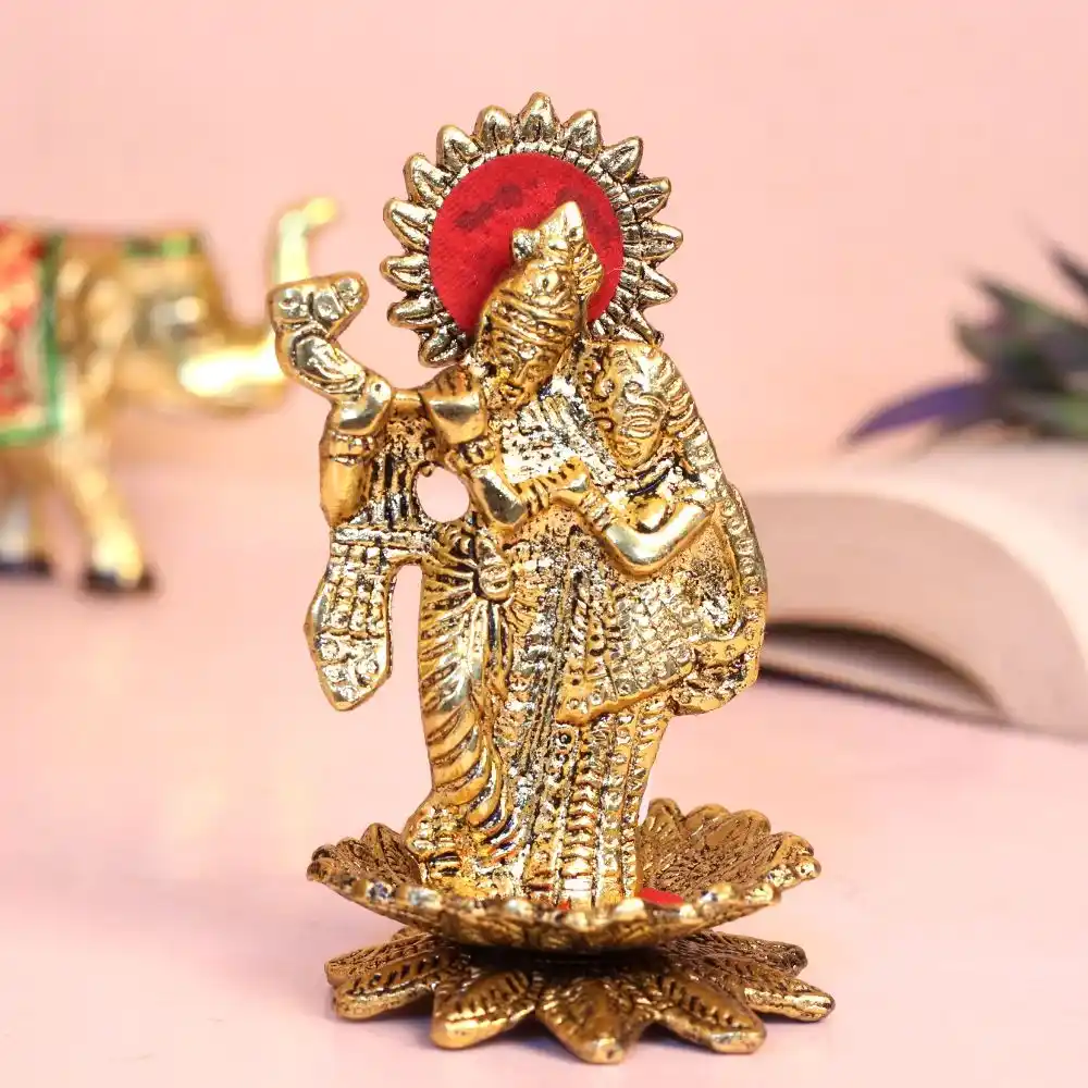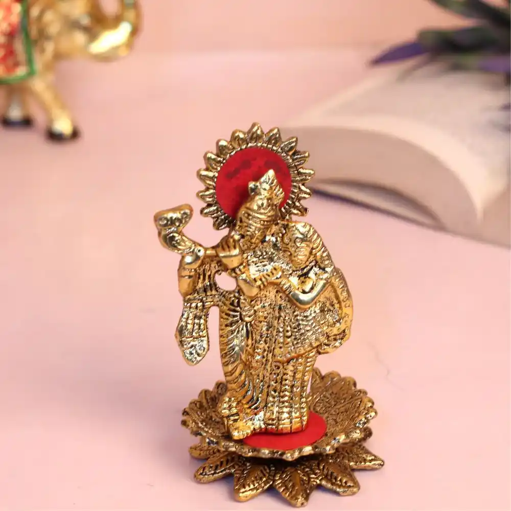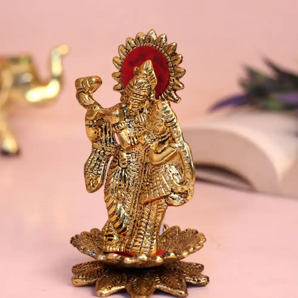 - Design: Captures the divine romance of Radha and Krishna with intricate detailing, including their serene expressions and traditional attire. The figurine is set on a beautifully designed kamal (lotus) base, symbolizing purity and spirituality.