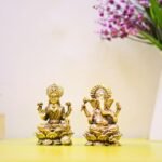 Welcome prosperity and wisdom into your home with this beautiful Lakshmi Ganesh Idol Set. These essential god idols, depicting Goddess Lakshmi (Goddess of Wealth) and Lord Ganesh (Remover of Obstacles), are masterfully crafted from high-quality Brass and feature them seated on individual lotus pedestals, symbolizing purity and growth. This set is crucial for starting any new venture and for inviting good fortune and success into your life. The idols are designed with intricate detailing and an antique gold-tone finish, symbolizing the perfect combination of Riddhi (prosperity) and Siddhi (success). This set is an absolute necessity for your home temple and is especially important for Diwali Puja, Navratra Puja, and Dusshara Puja. They make an unparalleled choice for a premium religious gift, a cherished satsang gift, or a profound house warming gift.