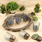 This exquisite serving tray set combines the beauty of metalwork and blue pottery, creating a stunning and functional piece. The oval-shaped tray features intricate metalwork with handles, while the four matching glasses are adorned with beautiful blue and white patterns. This set is perfect for serving snacks, desserts, or as a decorative centerpiece.