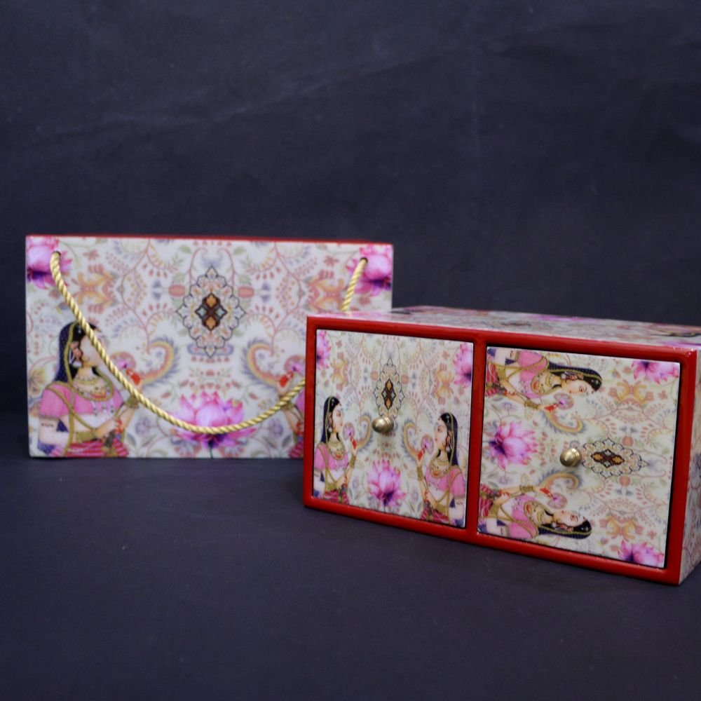 This elegant wooden jewelry box is a perfect addition to any dressing table or bedroom. The box features intricate floral designs and a beautiful color palette, adding a touch of sophistication to your space. The box is designed with a handle for easy carrying and features multiple compartments for storing your jewelry and other valuables.